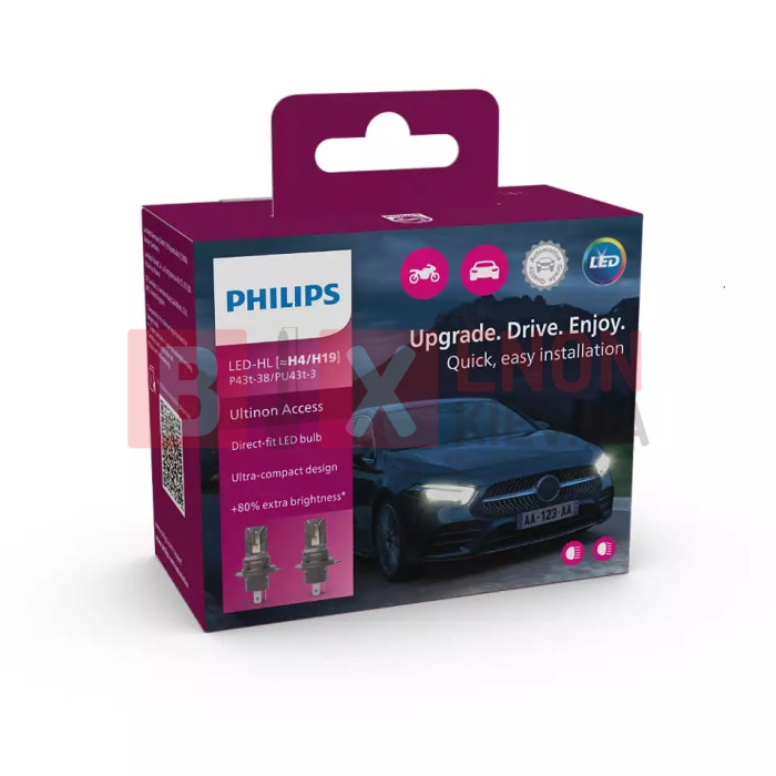 Серія світлодіодних ламп Ultinon Access +80% – це новий стандарт для модернізованих світлодіодних ламп, які яскравіше та біліше світло чим від стандартного галогенового світла. Світлодіодні лампи Ultinon Access +80% гарантують вам надзвичайну видимість під час керування транспортним засобом. Освітлення дороги, яке вони забезпечують, яскравіше й рівномірніше в порівнянні з мінімальним дозволеним стандартом для галогенних ламп.