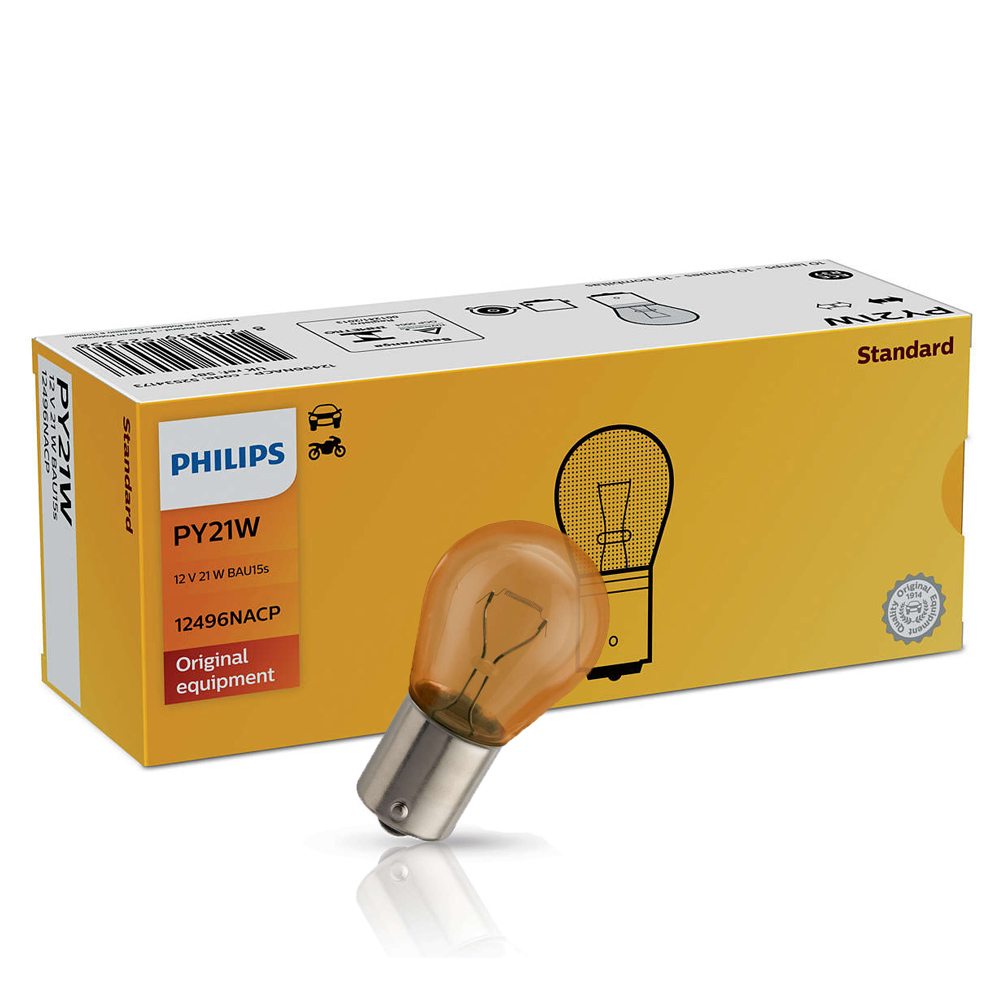 Галогенна лампа Philips PY21W Vision 12496NACP - лампа призначена для використання в сигнальному або салонному освітленні автомобіля. Лампа забезпечує яскравий жовтий відтінок світіння.