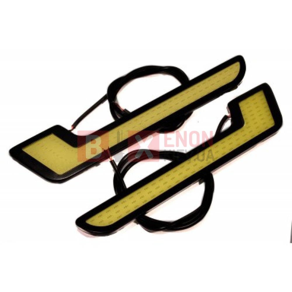 Ходові вогні DRL COB "кут" - комплект з 2-х модулів ДХО, що працюють на базі сучасних діодів типу COB, які забезпечують рівномірне яскраве блакитне свічення. Характеристики: напруга живлення - 12 В; тип діодів - COB; габаритні розміри , см - 17х1, 7х0, 4; колір свічення - білий; тип кріплення - двосторонній скотч. Сучасні ходові вогні найчастіше являють собою модуль з певною кількістю світлодіодів, що випромінюють яскраве біле світло. ДХО характеризуються простотою в монтажі (без застосування додаткового інструменту та володіння спеціальними навичками). Дизайн та яскравість ходових вогнів Ви визначаєте самі, керуючись особистими побажаннями та смаком