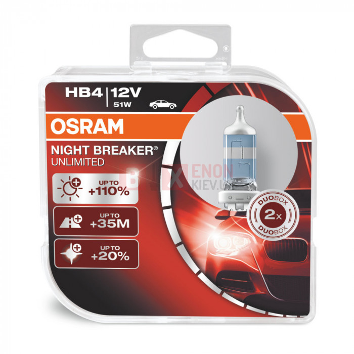 Галогенні лампи OSRAM 9006NBU HB4 Night Breaker Unlimited - лампа призначена для використання в ближньому, дальньому чи протитуманному освітленні автомобіля. Night Breaker Unlimited випромінює на 110% більше світла в порівнянні зі стандартними галогенними лампами, світловий промінь цієї лампи на 35 метрів довше, а світло на 20% більше білий. Галогенні лампи OSRAM 9006NBU HB4 Night Breaker Unlimited - це відмінне співвідношення ціни і якості!