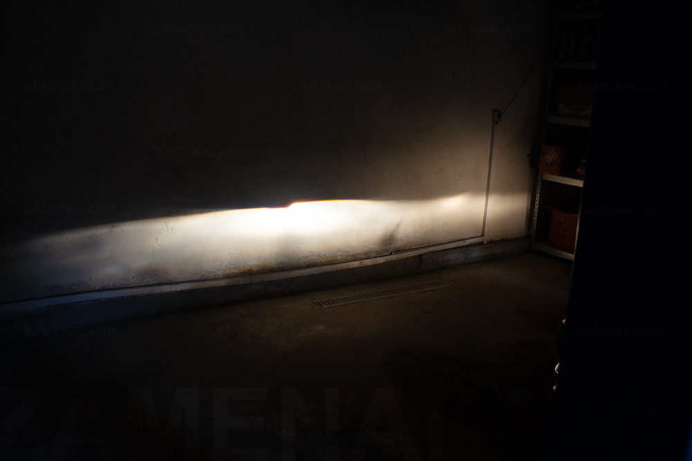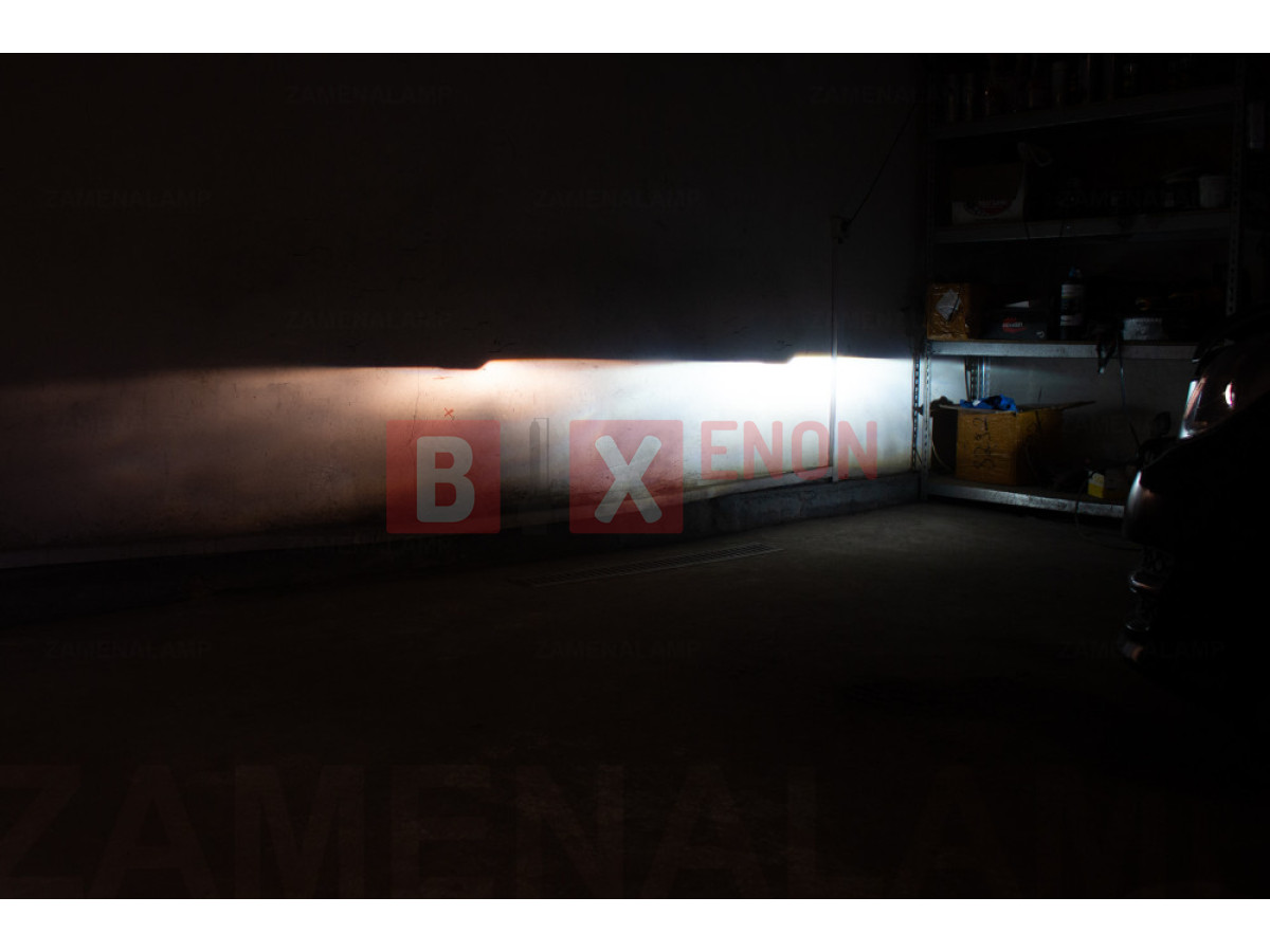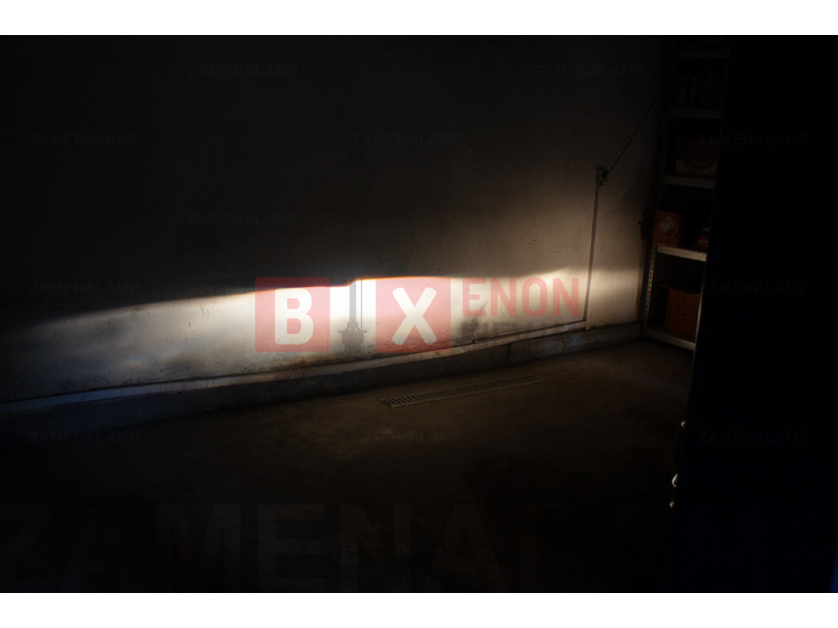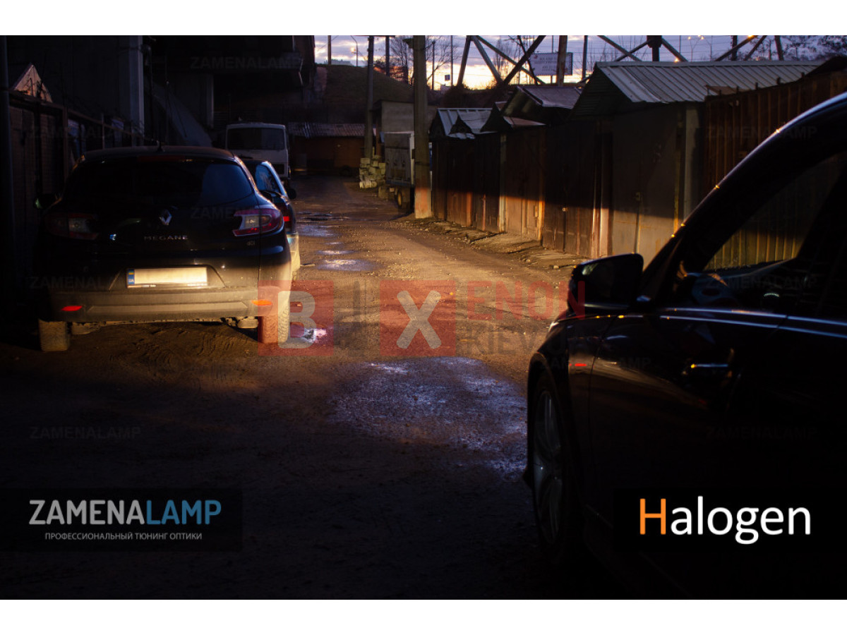Для прикладу різниці яскравості світла, встановили в праву лінзу Білінзи Hella 3R Universal ксенонову лампу з цоколем D2S, зліва встановлена лінза Білінзи Hella 3R Universal з галогенною лампою Н7 у відбивачі лізни. Тобто на фото різниця відчутна по відтінку світла та по яскравості.