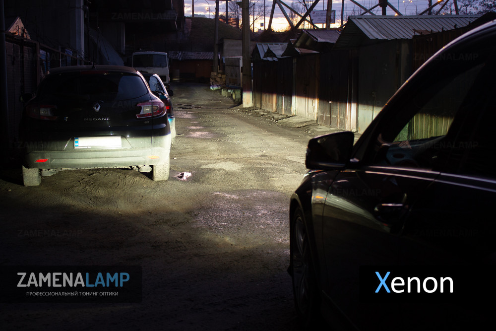 Та порівняння світла фар автомобіля після встановлення лінз Білінзи Hella 3R Universal у рефлектор ближнього світла фар із ксеноновими лампами D2S та блоками розпалу 35W.