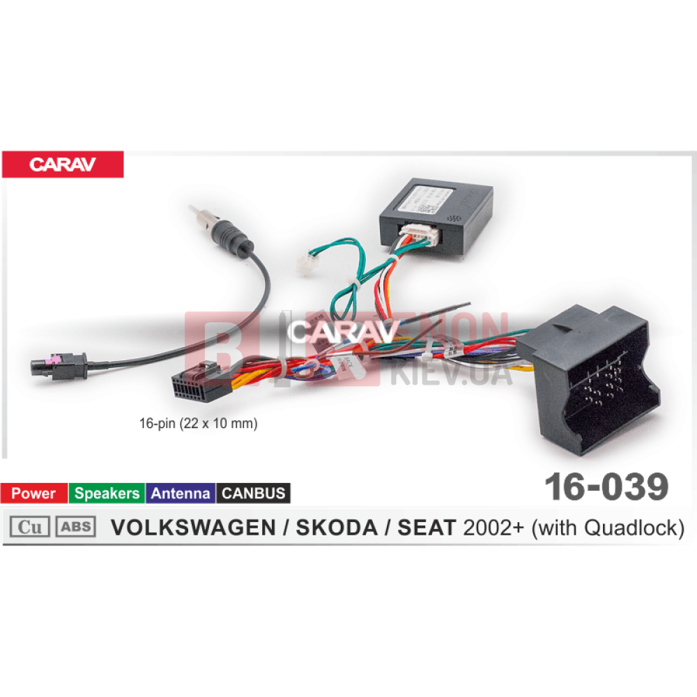 Комплект проводів для підключення 9"/10.1" ANDROID-АВТОМАГНІТОЛ (16-pin) для VOLKSWAGEN-SKODA-SEAT 2002+ (all with Quadlock) / Power + Speakers + Antenna + CANBUS