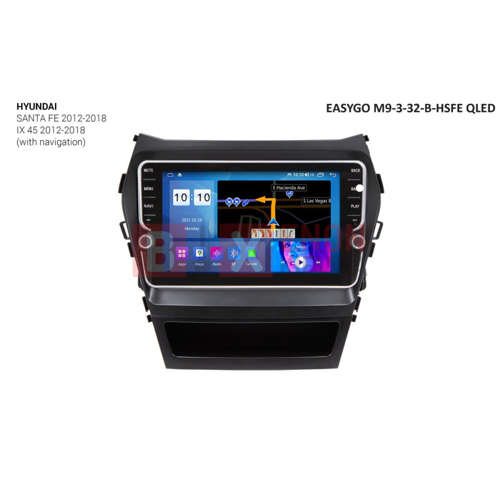 Штатная мультимедийная система EasyGo M9-3-32-B-HSFE QLED предназначена для установки в автомобиль Hyundai Santa Fe, iX-45 2012-2018 (только для автомобилей c навигацией).