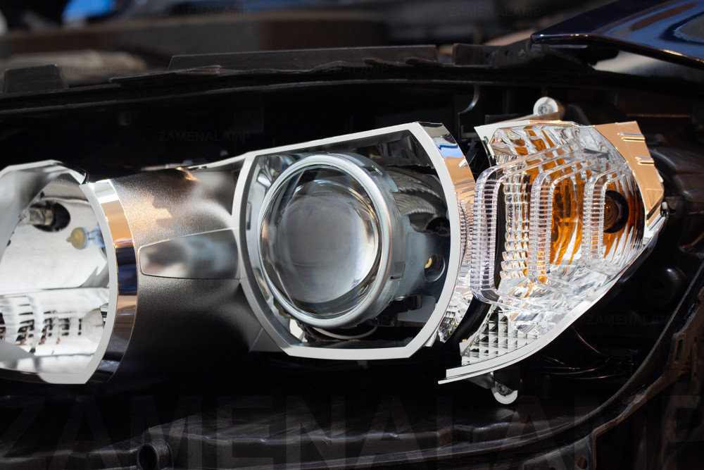 Закрепили биксеноновую линзу в отражателе ближнего света левой фары.