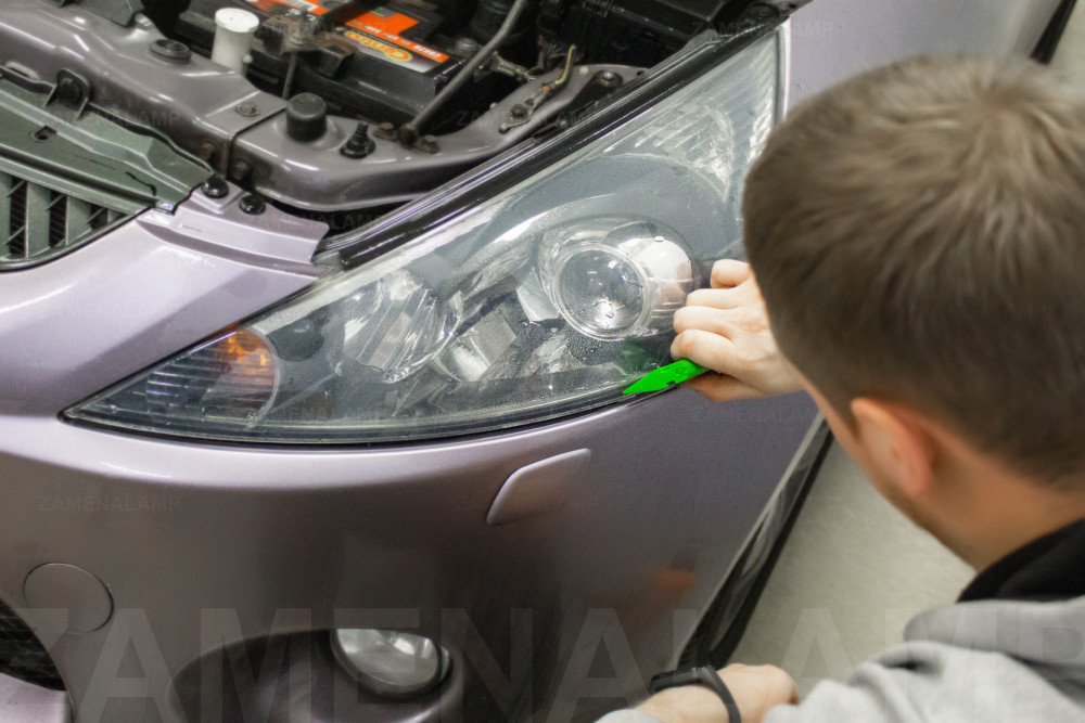 Процесс оклейки (бронирования) фары антигравийной пленкой.