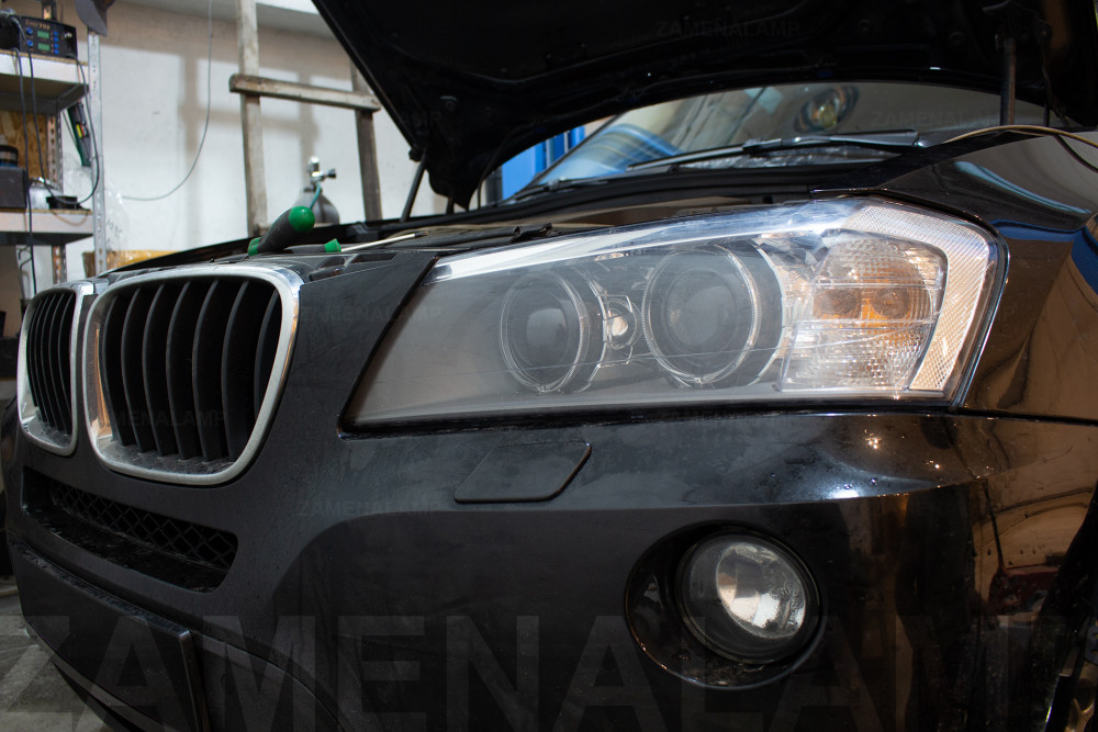 BMW X3 F25 замена штатных ксеноновых линз на биксеноновые линзы Hella 3R F1