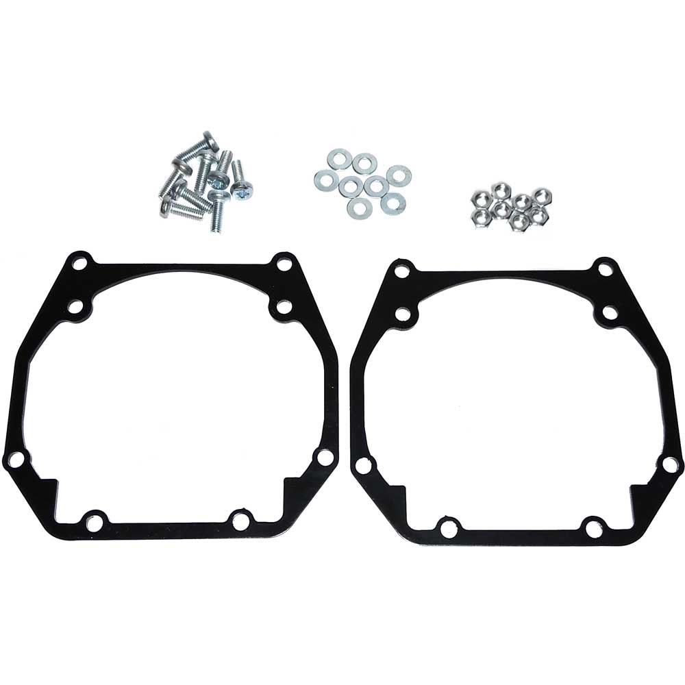 Комплект переходных рамок для замены линз для фар автомобиля значительно упрощает и ускоряет работу по установке или замене новых линз, сохраняет адаптивную функцию линз в фаре и максимально соблюдает все технические размеры и регулирует угол наклона фар автомобиля. При использовании переходных рамок линза становится на заводское место в фаре, соответственно сохраняется горизонт свечения и светотеневая граница свечения линз. Для некоторых автомобилей при использовании переходных рамок требуется минимальная доработка креплений между корпусом посадочного места штатных заводских линз и линз, которые нужно установить в фару автомобиля.