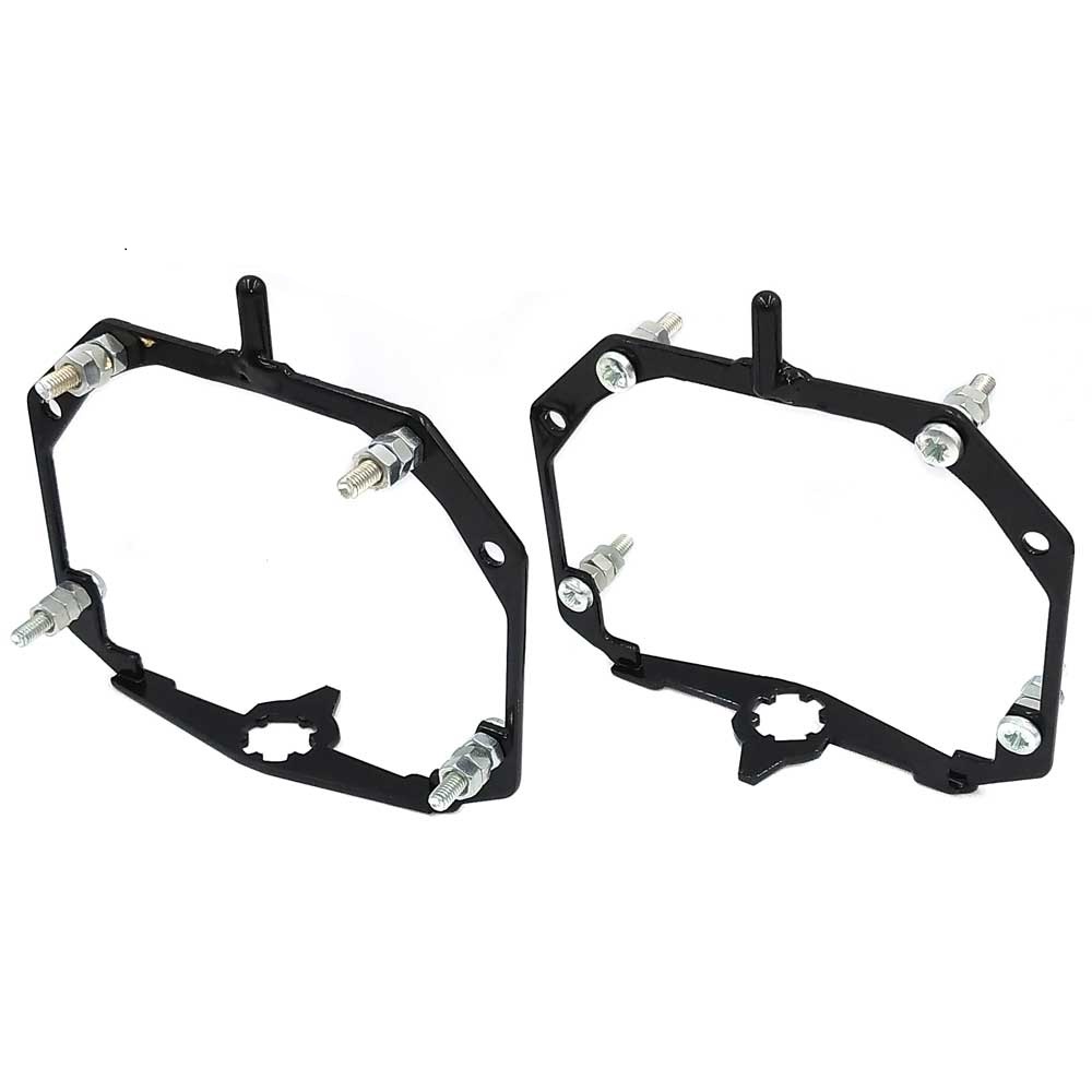 Комплект переходных рамок для замены линз для фар автомобиля значительно упрощает и ускоряет работу по установке или замене новых линз, сохраняет адаптивную функцию линз в фаре и максимально соблюдает все технические размеры и регулирует угол наклона фар автомобиля. При использовании переходных рамок линза становится на заводское место в фаре, соответственно сохраняется горизонт свечения и светотеневая граница свечения линз. Для некоторых автомобилей при использовании переходных рамок требуется минимальная доработка креплений между корпусом посадочного места штатных заводских линз и линз, которые нужно установить в фару автомобиля.
