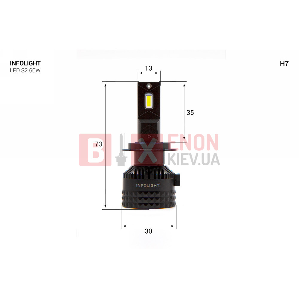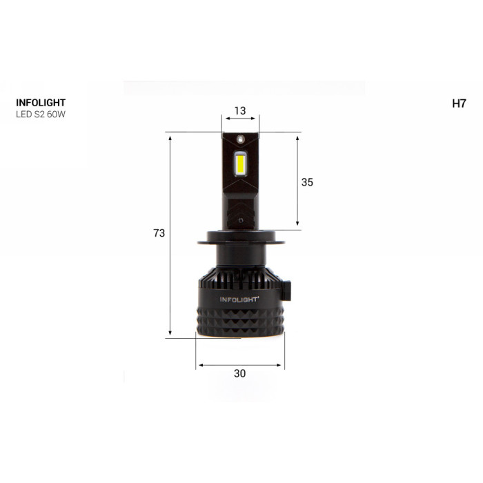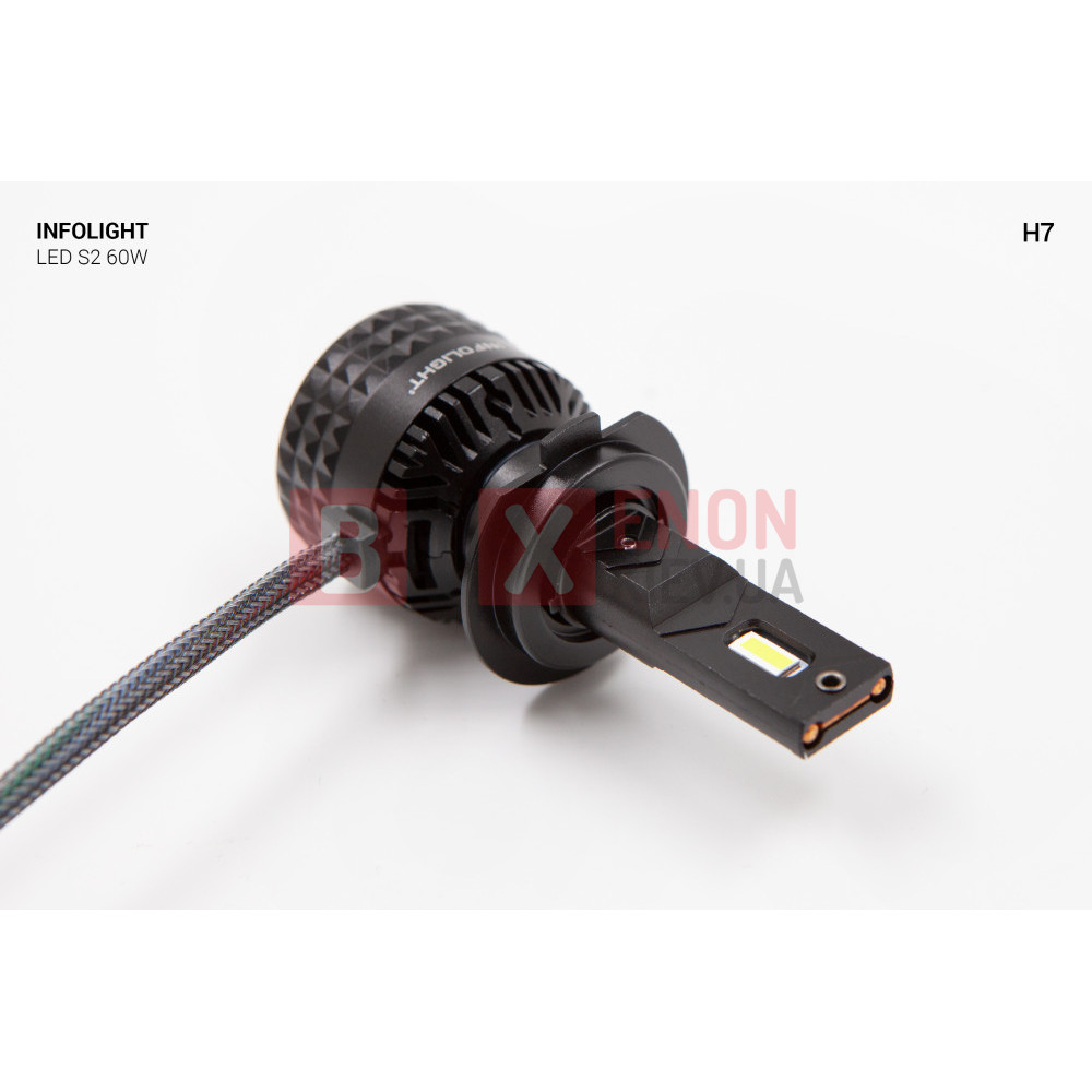 Светодиодная LED лампа Infolight S2 Н7 - это новинка в мире автомобильных LED ламп со встроенным CANBUS и идеальным насыщенным cветом. Комплект светодиодных ламп Infolight S2 главной особенностью которых, является технологичность и компактность конструкции. Установка ламп производится в блок фар головного света. Конструкция лампы позволяет легко установить её в разъем под цоколь Н7. Infolight S2 обладают эффективными 3570 TOP CSP LED chip кристаллами, что позволяет увеличить световой поток до 13000 Лм с рабочей мощностью 60 Ватт. Система охлаждения ламп построена на базе радиатора и кулера (пассивное/активное), это самый надежный и результативный способ, который хорошо работает с мощными кристаллами. Корпус сделан из авиационного алюминия, что дает хорошие теплообменные характеристики.