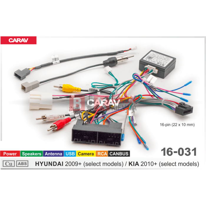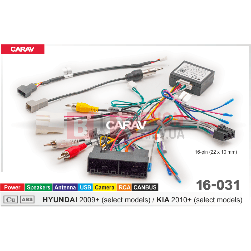 Комплект проводов для подключения 9" / 10.1" ANDROID-АВТОМАГНИТОЛ (16-pin) для HYUNDAI 2009+ (выборочн. модели) / KIA 2010+ (выборочн. модели) Питание + Динамики + Антенна + Камера + USB + RCA + CANBUS.