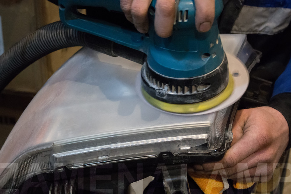 Процесс шлифовки стекла фары.