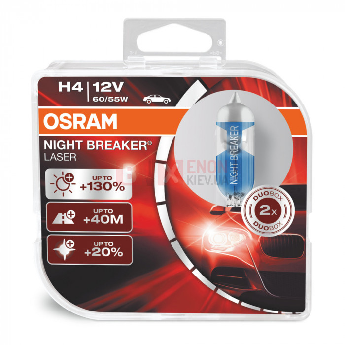 Галогенная лампа OSRAM 64193NBL H4 Night Breaker Laser — лампа предназначена для использования в ближнем и дальнем освещении автомобиля. Night Breaker Laser излучает на 130% больше света по сравнению со стандартными галогенными лампами, световой луч этой лампы на 40 метров длиннее, а свет на 20% более белый. В производстве ламп Night Breaker Laser используют лазерные технологии и добавление ксенонового газа в состав колбы, тем самым улучшается светоотдача.