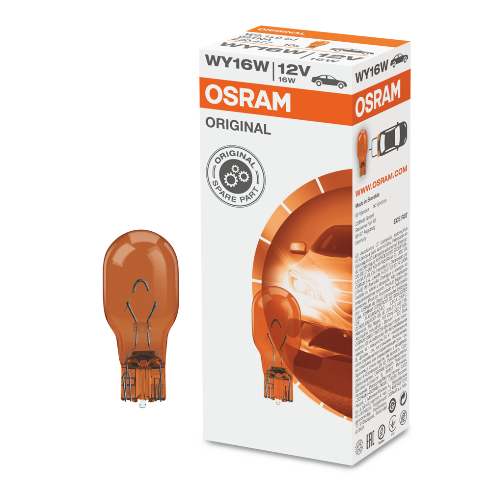 Галогенная лампа Osram WY16W 12V 16W Amber 921NA — применяется в сигнальном освещении автомобиля. Практичные, долговечные и экономичные лампы, идеальное решение для замены стандартных автомобильных ламп. Благодаря желтому оттенку свечения водитель будет прекрасно видеть дорожное покрытие при любых погодных и дорожных условиях.