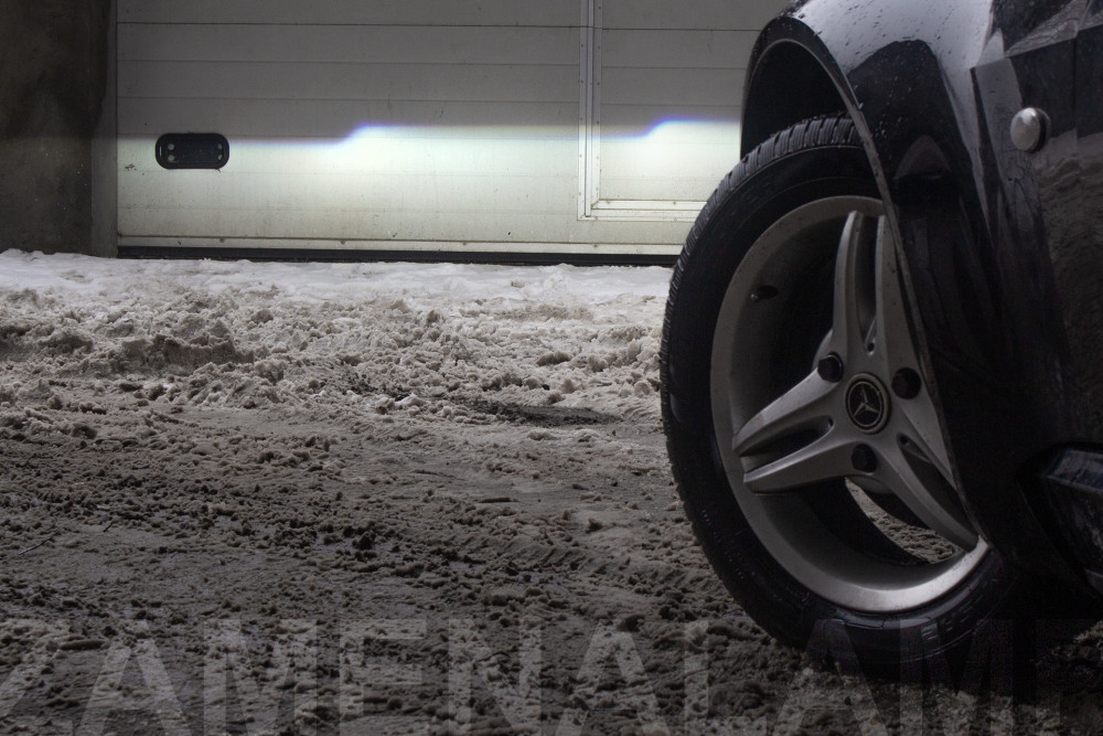 Свет фар автомобиля после замены штатных галогеновых монолинз в темное время суток.