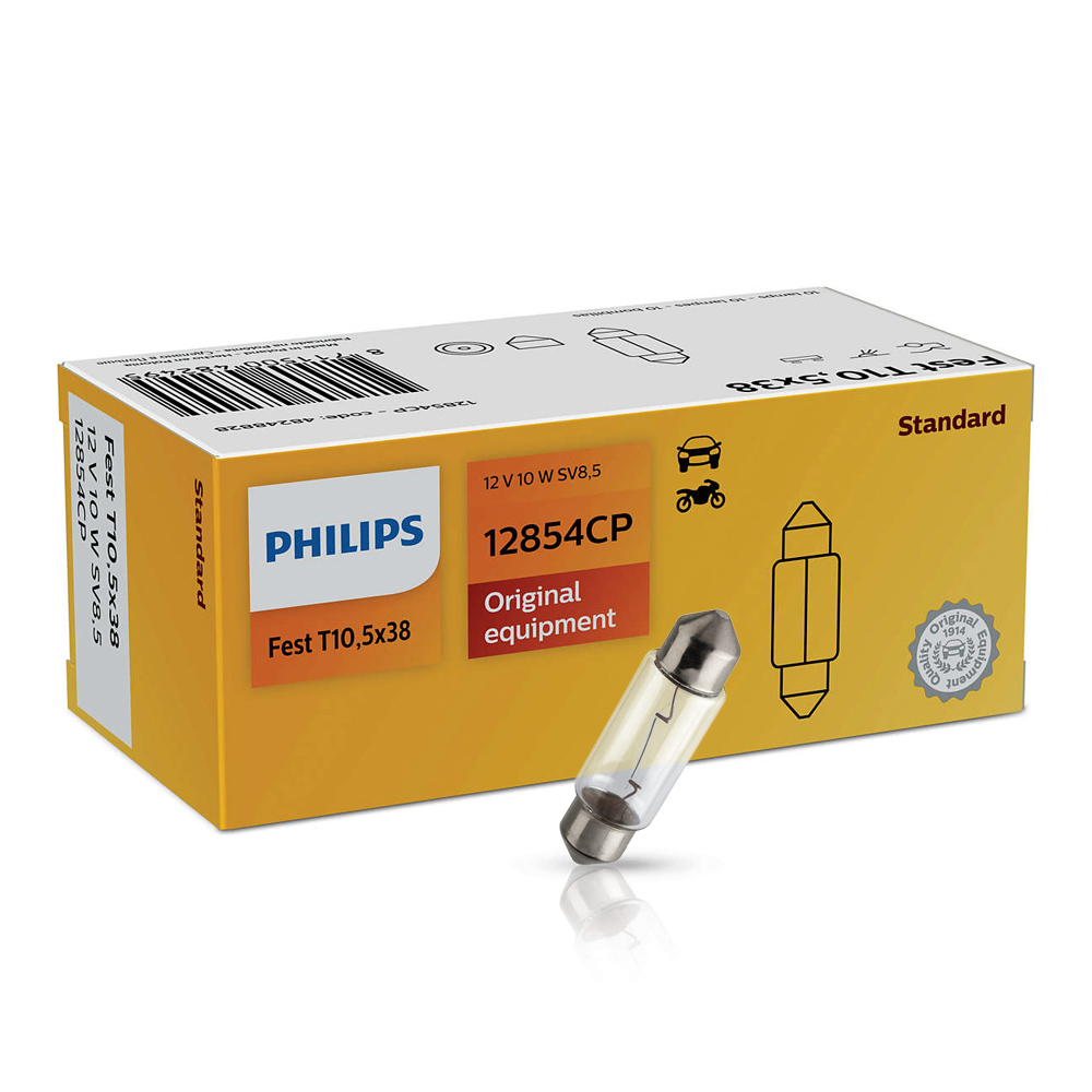 Галогенна лампа Philips C10W 38mm Vision 12854CP - лампа призначена для використання в сигнальному або салонному освітленні автомобіля. Лампа забезпечує яскравий жовтий відтінок світіння.